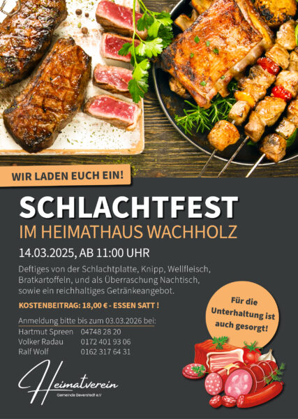 Am 14.3.2026 begeht der Heimatverein im Heimathaus Wachholz wieder das beliebte Schlachtfest mit Knipp, Wellfleisch, Bratkartoffeln und einer Getränkeauswahl sowie Nachtisch. Für Unterhaltung wird ebenfalls gesorgt.